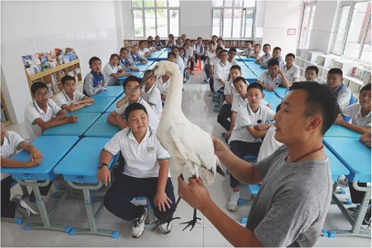 Dong Tao popularizes science knowledge to children using bird specimens at a children's palace in Chenguan township, Dongying city, east China's Shandong Province. (Photo/sd.dzwww.com)