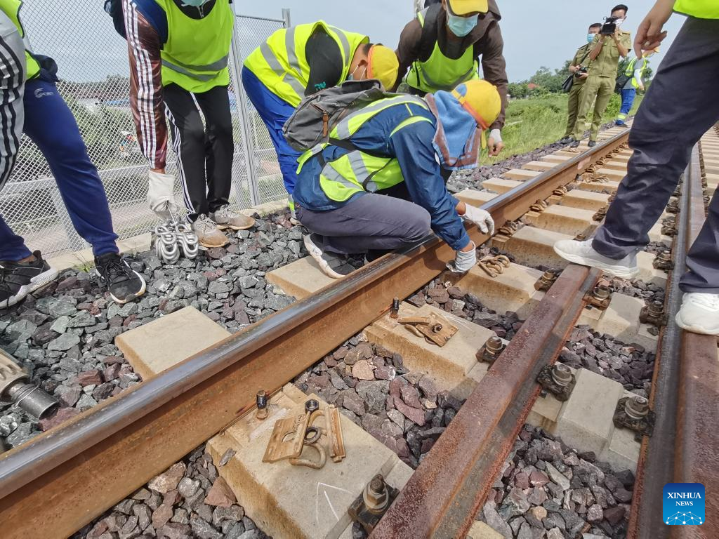Staff members of the Laos-China Railway Co., Ltd. (LCRC) restore railway facilities during a joint emergency exercise aimed at responding to security incidents on China-Laos Railway in Lao capital Vientiane, Sept. 27, 2022. (LCRC/Handout via Xinhua)