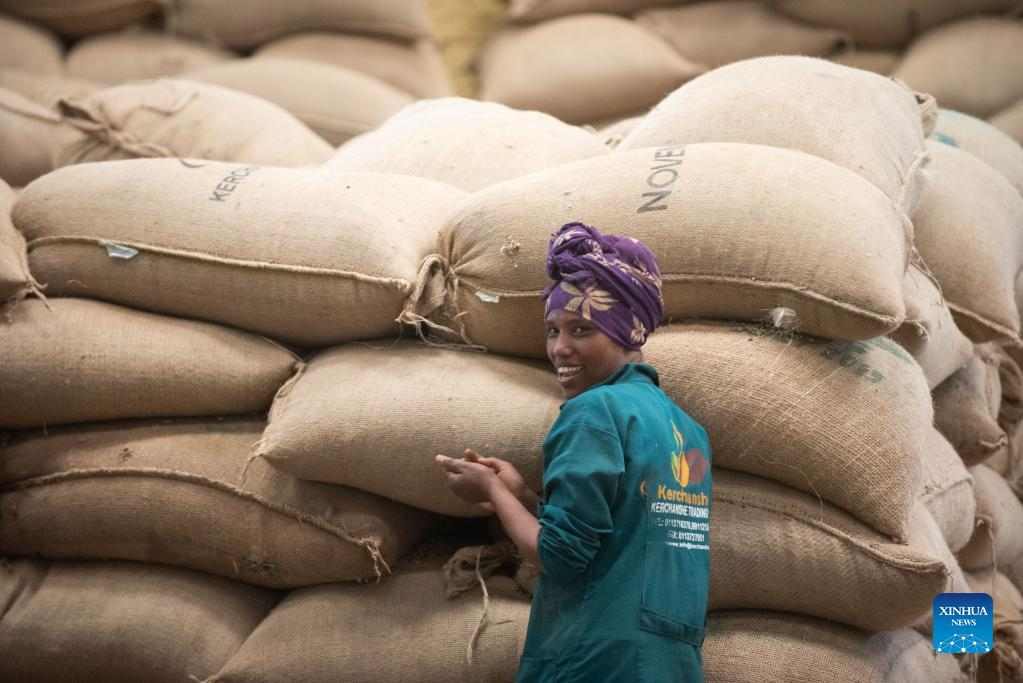 An employee works at a coffee processing plant in Addis Ababa, Ethiopia, Oct. 21, 2021. The increasing number of consumers and growing popularity of Ethiopia's coffee among the Chinese people is propelling Ethiopia's coffee export market, officials and coffee exporters said. (Xinhua/Michael Tewelde)