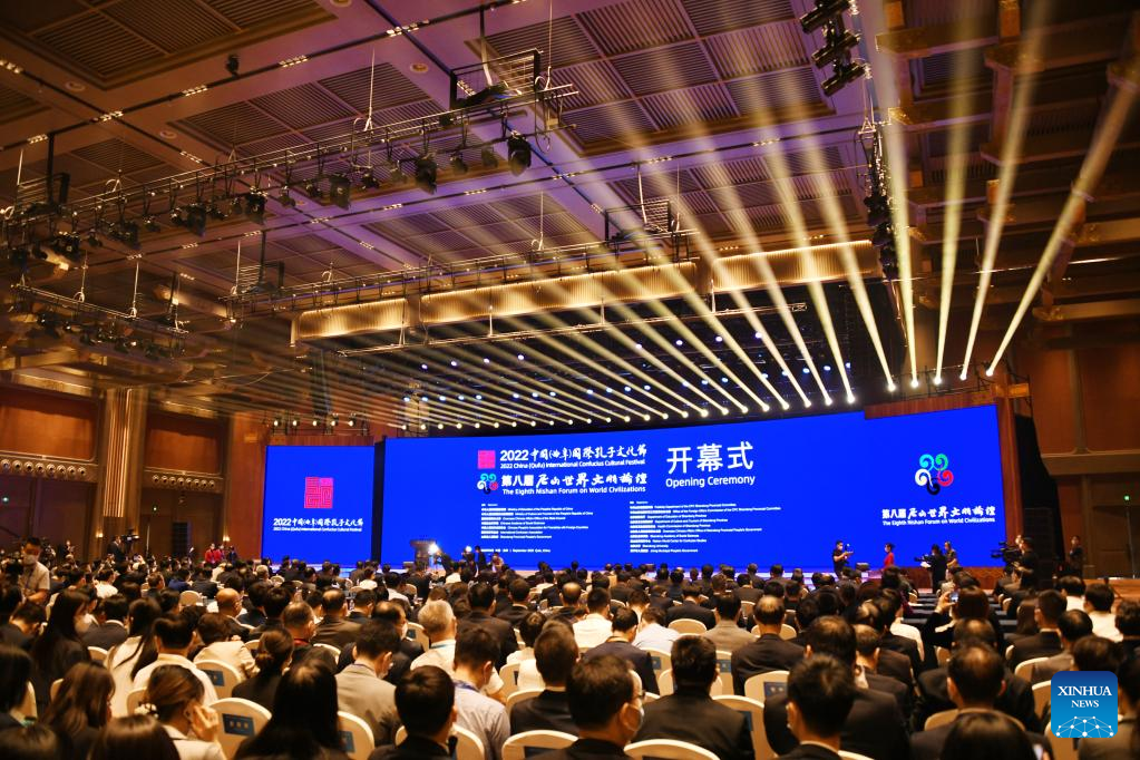 Photo taken on Sept. 27, 2022 shows the opening ceremony of 2022 China (Qufu) International Confucius Cultural Festival and the Eighth Nishan Forum on World Civilizations in Qufu, the birthplace of Confucius, in east China's Shandong Province. (Xinhua/Li Ziheng)