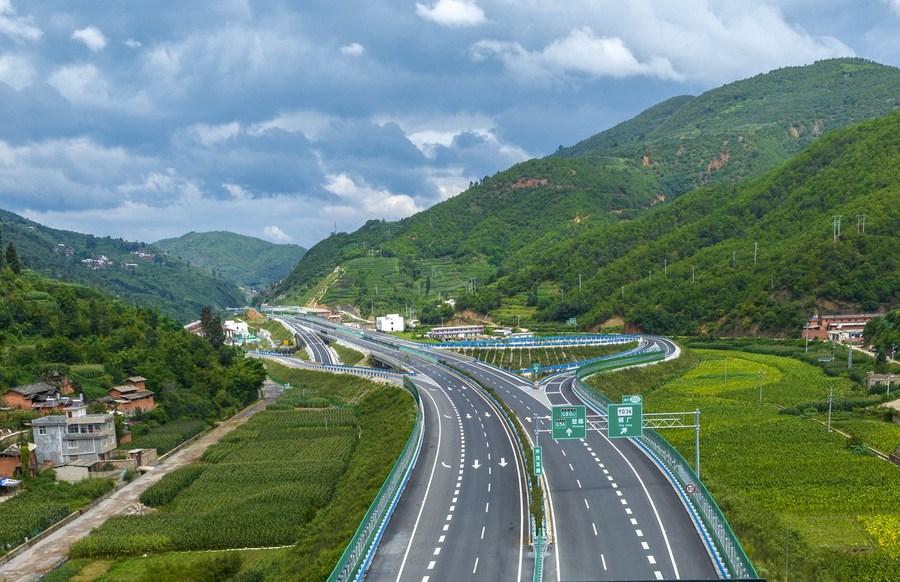 Aerial photo taken on Aug. 26, 2022 shows a section of the Yuxi-Chuxiong Expressway in southwest China's Yunnan Province. (Xinhua/Jiang Wenyao)