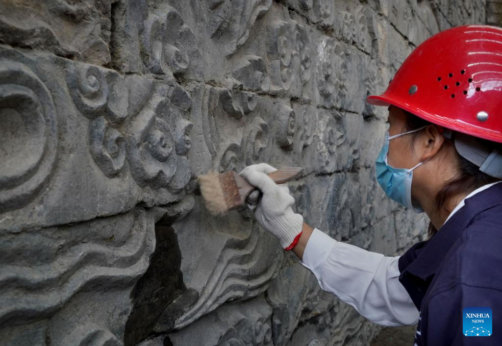 A staff member cleans a stone mural discovered in the Zhouqiao relics site in Kaifeng City, central China's Henan Province, Sept. 21, 2022.