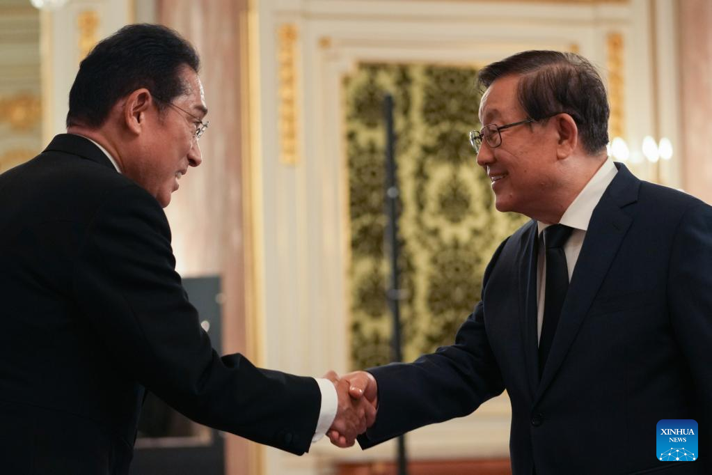 Wan Gang (R), representative of the Chinese government and vice chairman of the National Committee of the Chinese People's Political Consultative Conference, shakes hands with Japanese Prime Minister Fumio Kishida during the appreciation ceremony hosted by the Japanese government and former Japanese Prime Minister Shinzo Abe's family in Tokyo, Japan, Sept. 27, 2022. (Xinhua/Zhang Xiaoyu)