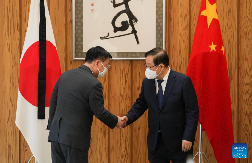 Wan Gang (R), representative of the Chinese government and vice chairman of the National Committee of the Chinese People's Political Consultative Conference, meets with Japan's Chief Cabinet Secretary Hirokazu Matsuno in Tokyo, Japan, Sept. 28, 2022. (Xinhua/Zhang Xiaoyu)