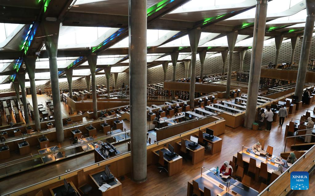 The interior of the Bibliotheca Alexandrina is pictured in Alexandria, Egypt, on Sept. 27, 2022. The China Cultural Center in Cairo on Tuesday donated books and audio-visual products to the Bibliotheca Alexandrina, a major library in the city of Alexandria on Egypt's Mediterranean coast. (Xinhua/Wang Dongzhen)