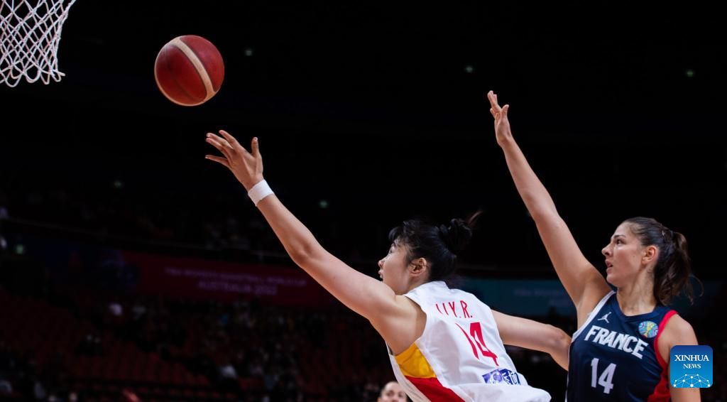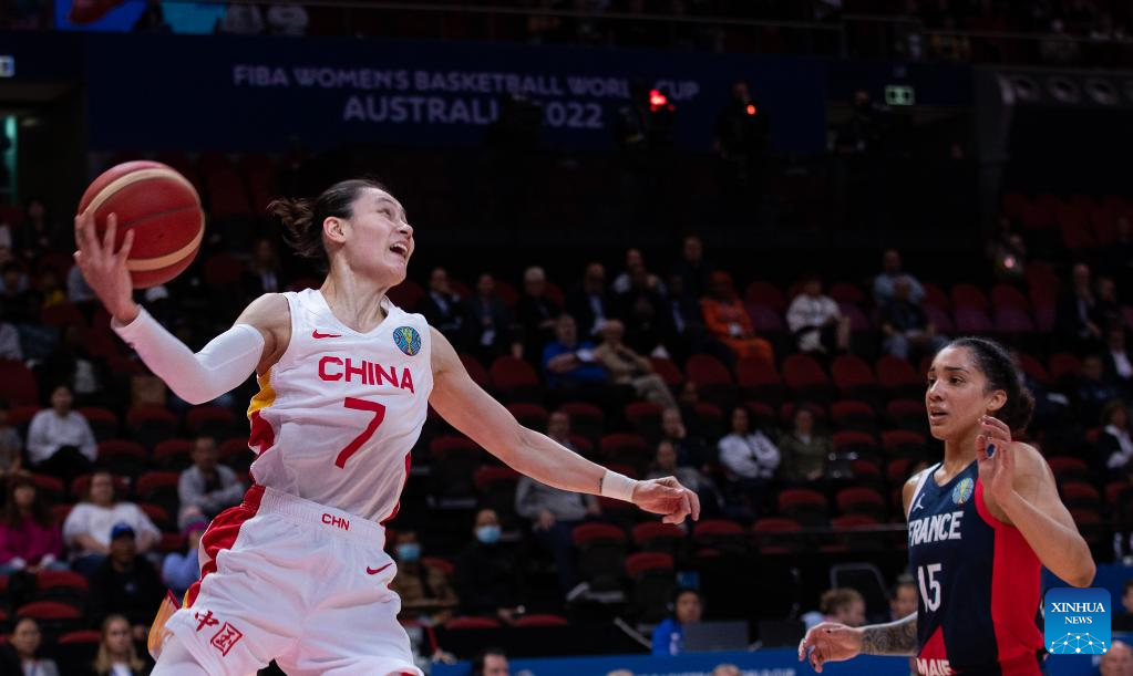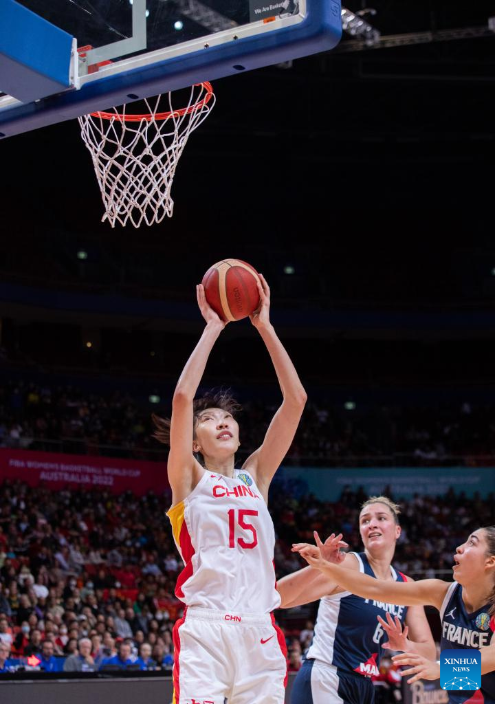 Yang Liwei (1st R) of China goes for a lay-up during the quater-final match between China and France at the FIBA Women's Basketball World Cup 2022 in Sydney, Australia, on Sept. 29, 2022. (Photo by Hu Jingchen/Xinhua)