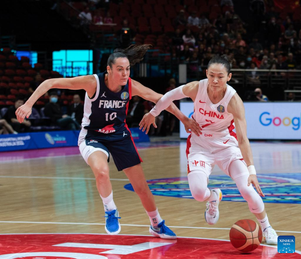 Yang Liwei (R) of China drives the ball against Sarah Michel of France during the quarter-finals match between China and France at the FIBA Women's Basketball World Cup 2022 in Sydney, Australia, on Sept. 29, 2022. (Photo by Hu Jingchen/Xinhua)