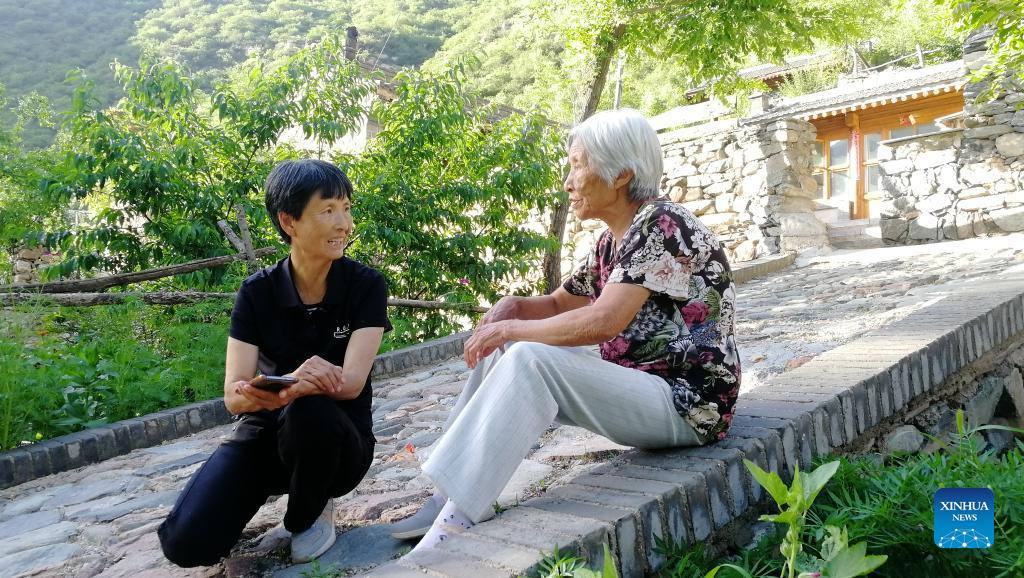 Liu Guizhen (L) chats with a villager in north China's Shanxi Province, July 6, 2022. (Xinhua)