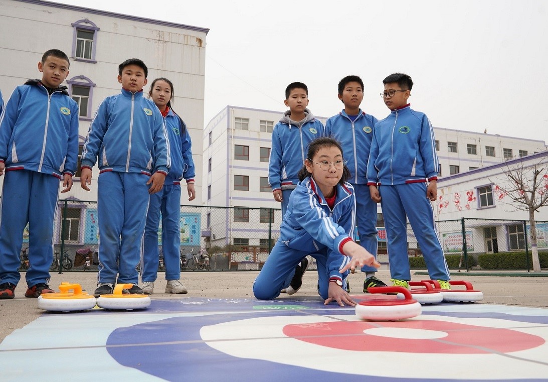 Students of a primary school in Xingtai, north China's Hebei province practice curling on the playground, March, 2021. (People's Daily Online/Liu Jidong)