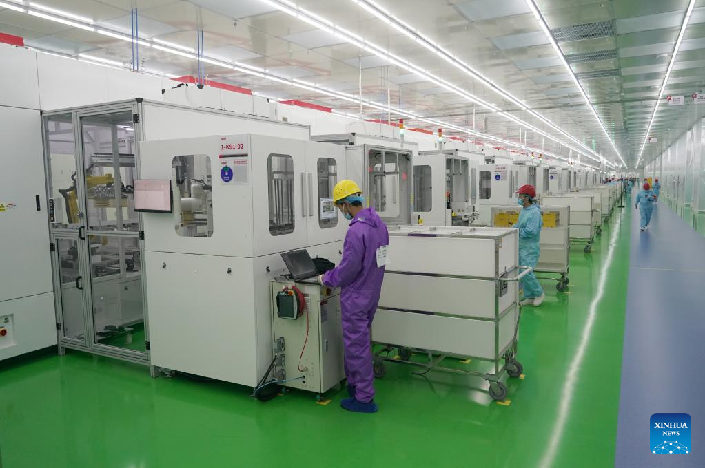 Workers work at a workshop of LONGi Solar Technology (Xixian New Area) Co., Ltd. in Xixian New Area, northwest China's Shaanxi Province, Sept. 28, 2022.