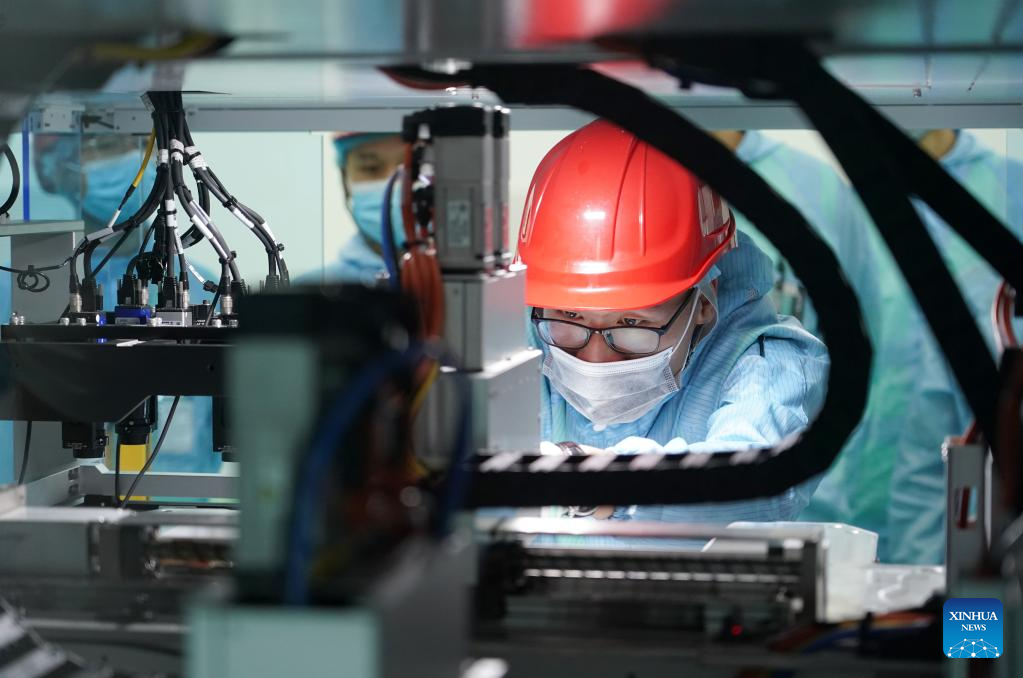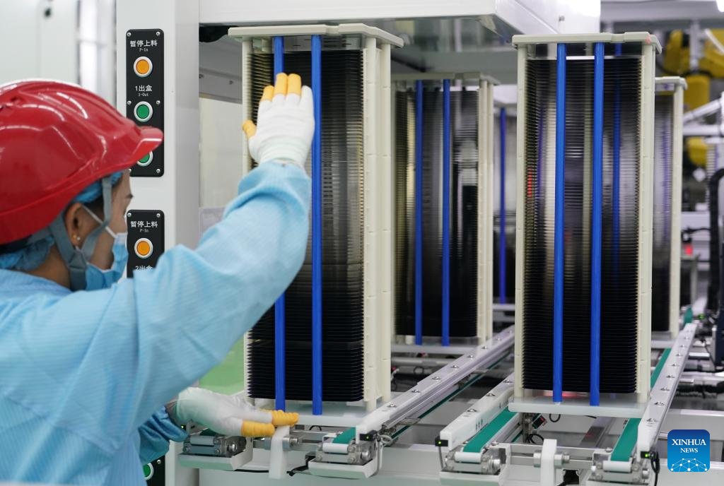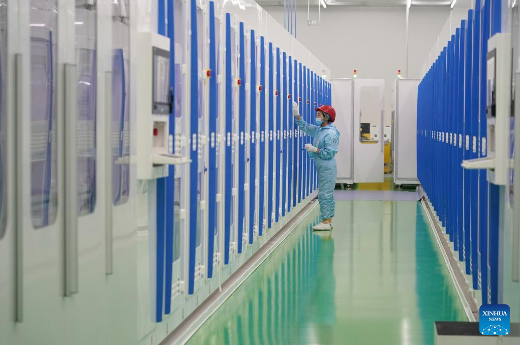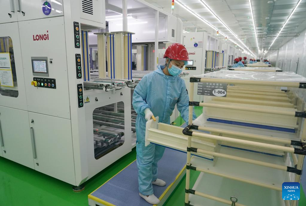 A worker works at a workshop of LONGi Solar Technology (Xixian New Area) Co., Ltd. in Xixian New Area, northwest China's Shaanxi Province, Sept. 28, 2022.