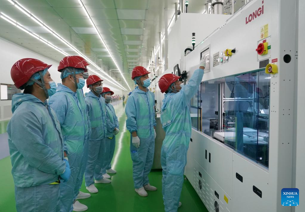 Workers take part in a training course at a workshop of LONGi Solar Technology (Xixian New Area) Co., Ltd. in Xixian New Area, northwest China's Shaanxi Province, Sept. 28, 2022.