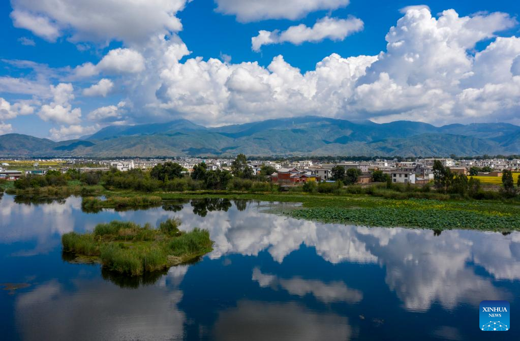 Aerial photo taken on Sept. 28, 2022 shows the scenery of Eryuan West Lake in Eryuan County of Dali Bai Autonomous Prefecture, southwest China's Yunnan Province. (Xinhua/Chen Xinbo)