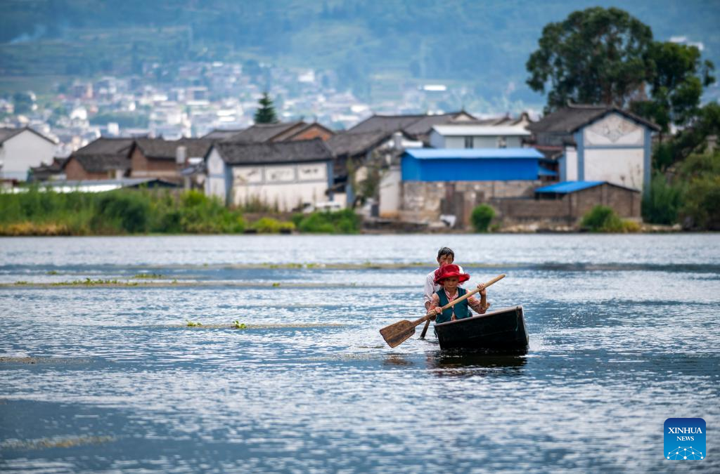 Villagers row a boat in Eryuan West Lake in Eryuan County of Dali Bai Autonomous Prefecture, southwest China's Yunnan Province, Sept. 28, 2022. (Xinhua/Chen Xinbo)