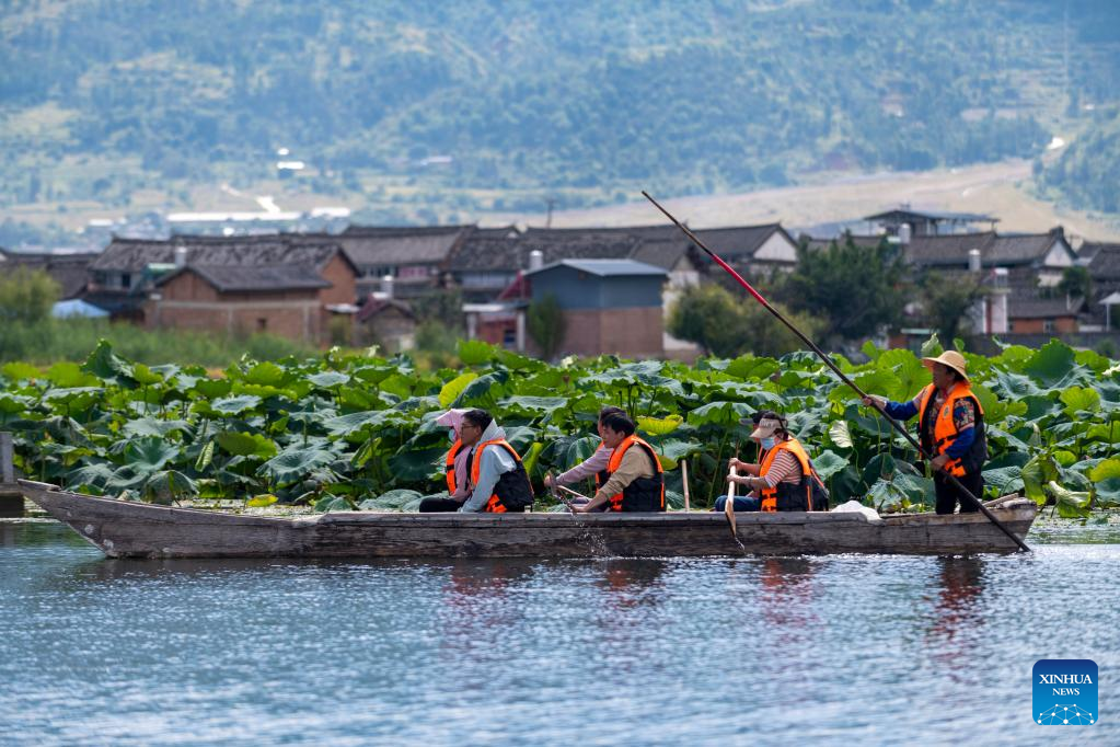 Tourists row a boat in Eryuan West Lake in Eryuan County of Dali Bai Autonomous Prefecture, southwest China's Yunnan Province, Sept. 28, 2022. (Xinhua/Chen Xinbo)