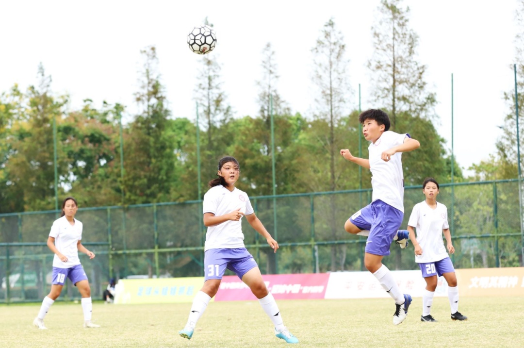 Photo shows members of the girls' football team of Liuba Middle School playing in a competition during the first China Youth Football League (CYFL). (Photo/People's Daily App)