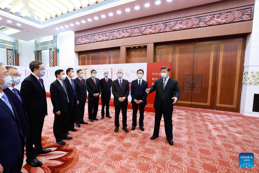 Chinese President Xi Jinping, also general secretary of the Communist Party of China (CPC) Central Committee and chairman of the Central Military Commission, views an exhibition on the C919 project's achievements at the Great Hall of the People in Beijing, capital of China, Sept. 30, 2022. Vice Premier Han Zheng, also a member of the Standing Committee of the Political Bureau of the CPC Central Committee, attended the event. (Xinhua/Li Xueren)