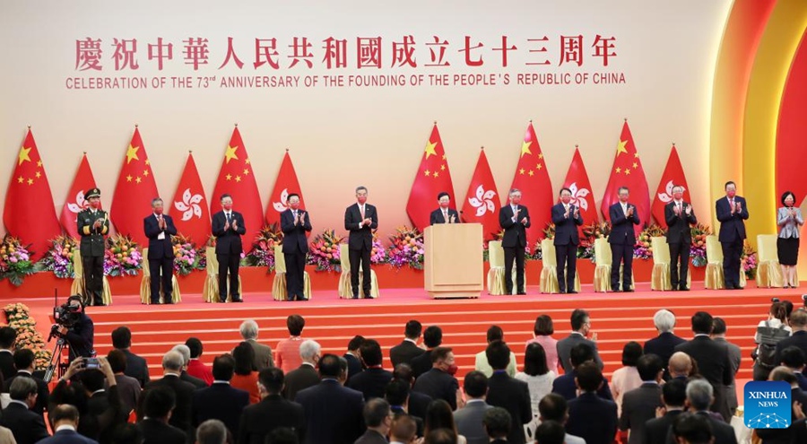 HONG KONG, Oct. 1 (Xinhua) -- The government of China's Hong Kong Special Administrative Region (HKSAR) on Saturday held a flag-raising ceremony and a reception to celebrate the 73rd anniversary of the founding of the People's Republic of China (PRC).