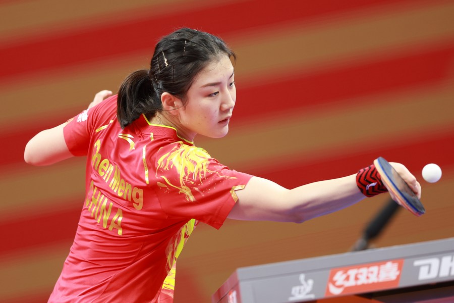 Chen Meng of China hits a return during the women's teams group 1 match against Daniely Rios of Puerto Rico at the 2022 ITTF World Team Table Tennis Championships Finals in Chengdu, southwest China's Sichuan Province, Oct. 2, 2022. (Xinhua/Liu Xu)