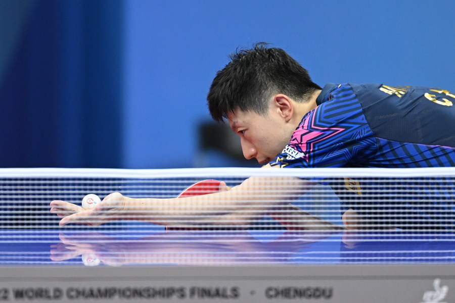 Ma Long of China serves during the men's teams group 1 match against Mishel Levinski of the United States at the 2022 ITTF World Team Table Tennis Championships Finals in Chengdu, southwest China's Sichuan Province, Oct. 2, 2022. (Xinhua/Xu Bingjie)