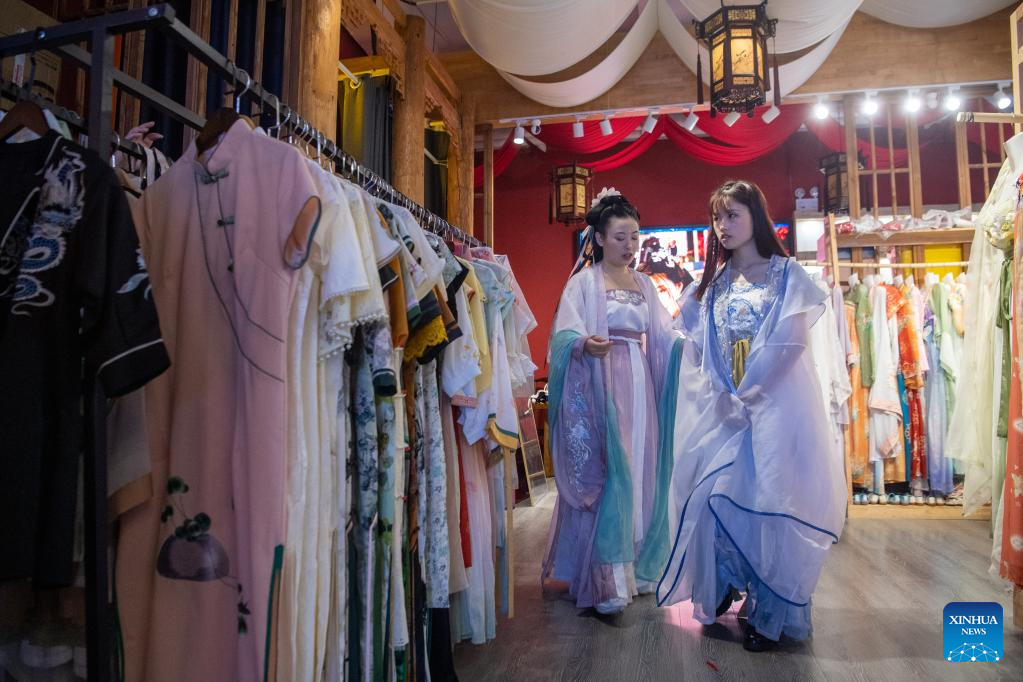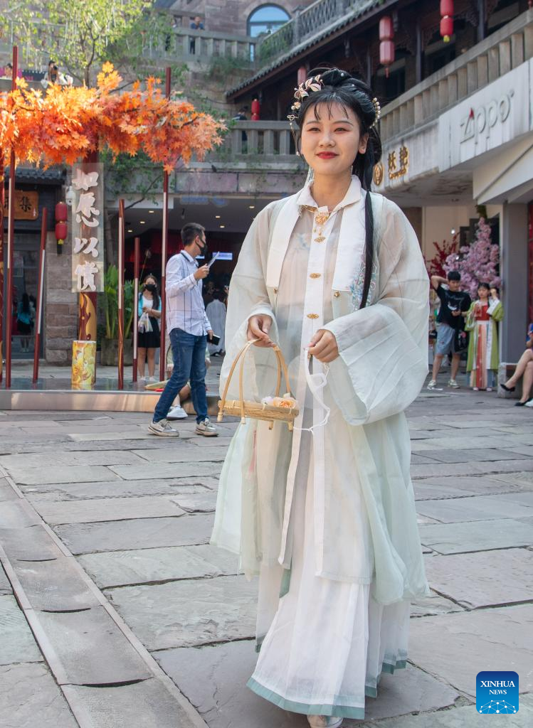 Tourists try traditional Chinese garments in Ciqikou ancient town, southwest China's Chongqing Municipality, Oct. 2, 2022. During the National Day holiday, the scenic area Ciqikou has conducted various activities themed with traditional Chinese culture to attract tourists. (Xinhua/Tang Yi)