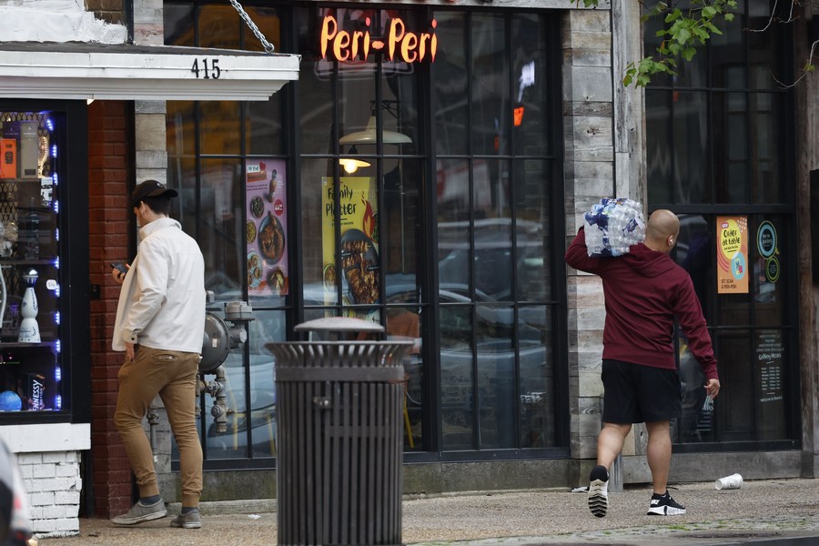 Pedestrians walk past a restaurant in Washington, D.C., the United States, on May 6, 2022. (Photo by Ting Shen/Xinhua)