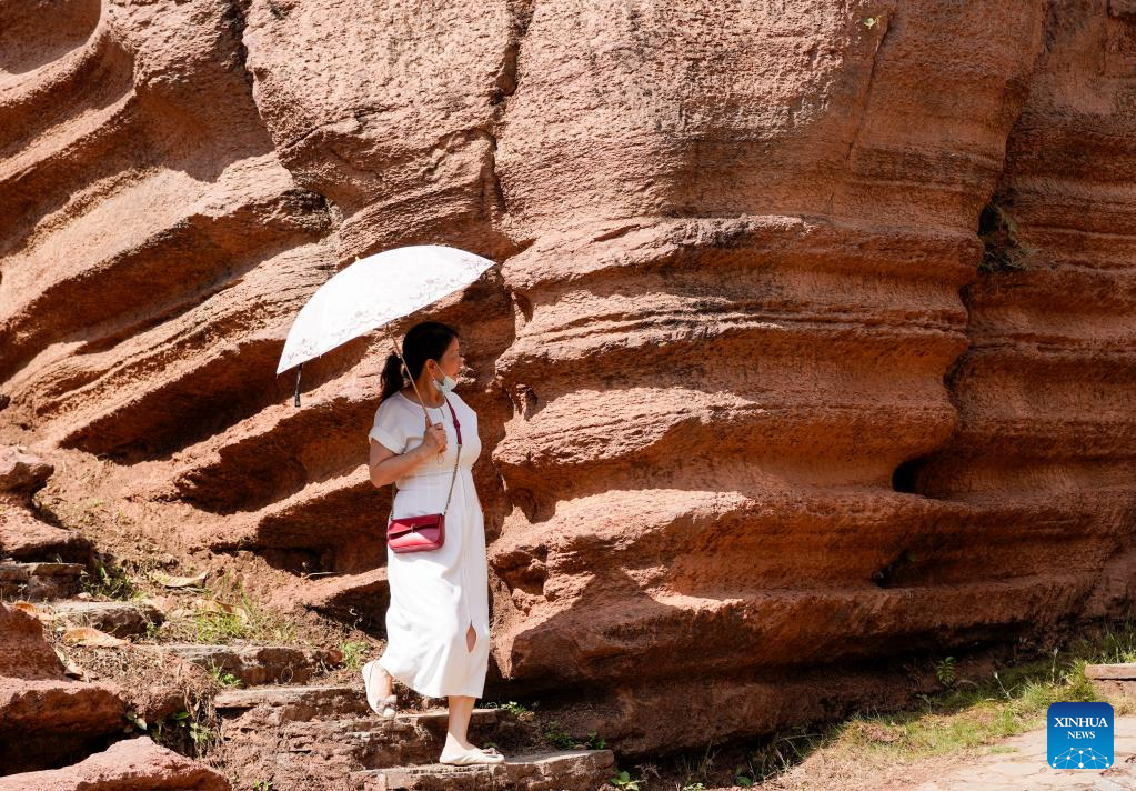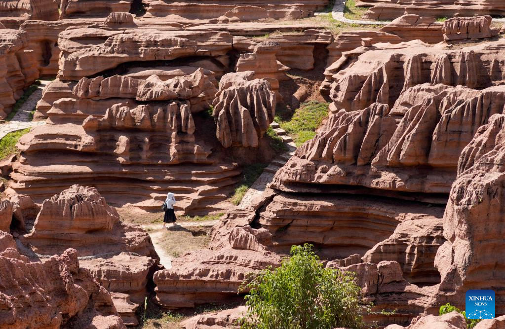 A tourist visits a red stone forest geopark in Youyang Tujia and Miao Autonomous County, southwest China's Chongqing Municipality, Oct. 3, 2022. The Youyang red stone forest geopark, which has the karst landform, opened to the public during the National Day holiday. (Xinhua/Liu Chan)