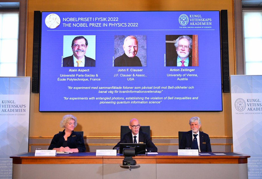 The announcement of the 2022 Nobel Prize in Physics is held in Stockholm, Sweden, Oct. 4, 2022. (Xinhua/Ren Pengfei)