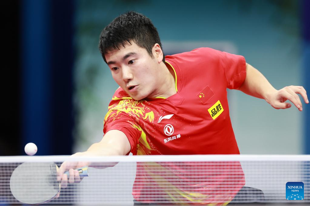 Liang Jingkun of China hits a return to Pattaratorn Passara of Thailand during the men's teams group 1 match between China and Thailand at the 2022 ITTF World Team Table Tennis Championships Finals in Chengdu, southwest China's Sichuan Province, Oct. 4, 2022. (Xinhua/Liu Xu)