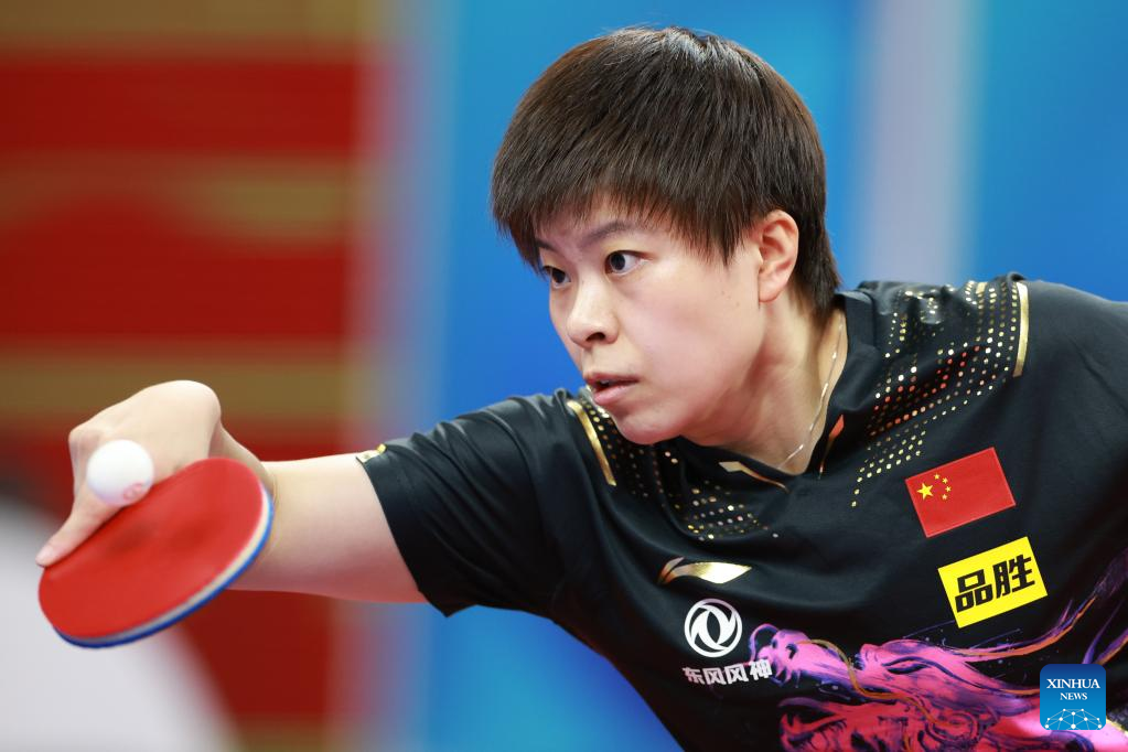 China's Wang Yidi hits a return against Malaysia's Chang Li Sian Alice during the women's teams group 1 match between China and Malaysia at the 2022 ITTF World Team Table Tennis Championships Finals in Chengdu, southwest China's Sichuan Province, Oct. 4, 2022. (Xinhua/Liu Xu)