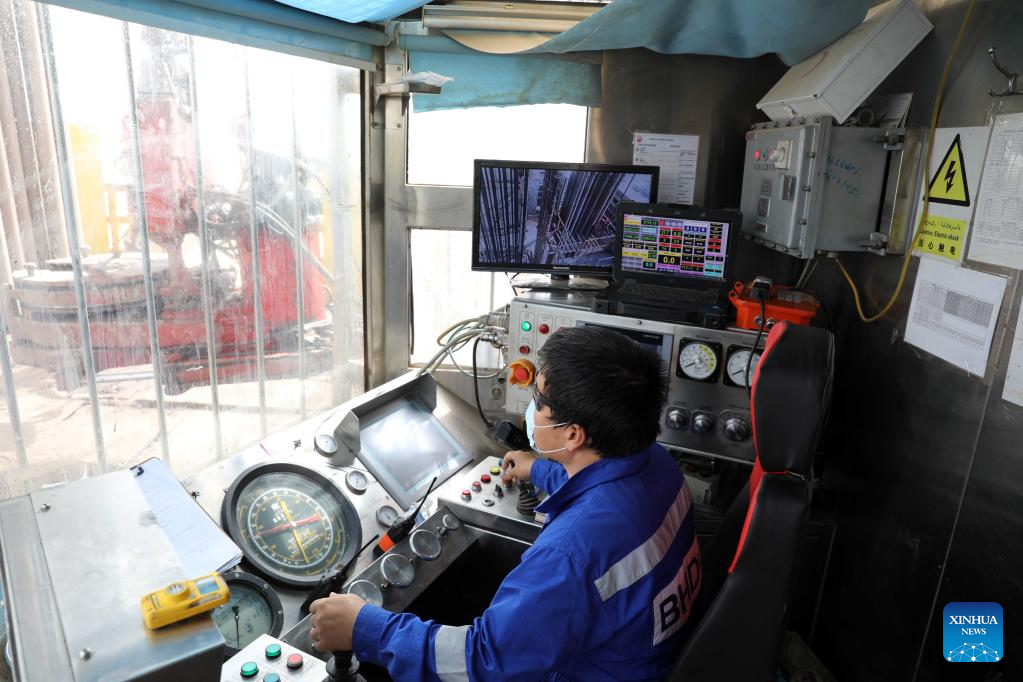 A Chinese engineer works in a control room of a drilling platform at PetroChina's Halfaya oil field in Maysan province, Iraq, on Sept. 25, 2022. (Xinhua/Khalil Dawood)