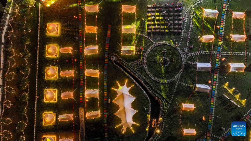 Aerial photo taken on Oct. 5, 2022 shows a view of a light show in Mengzi, southwest China's Yunnan Province. Various nightlife activities enrich people's leisure time during the National Day holiday. (Photo by Wang Yu/Xinhua)