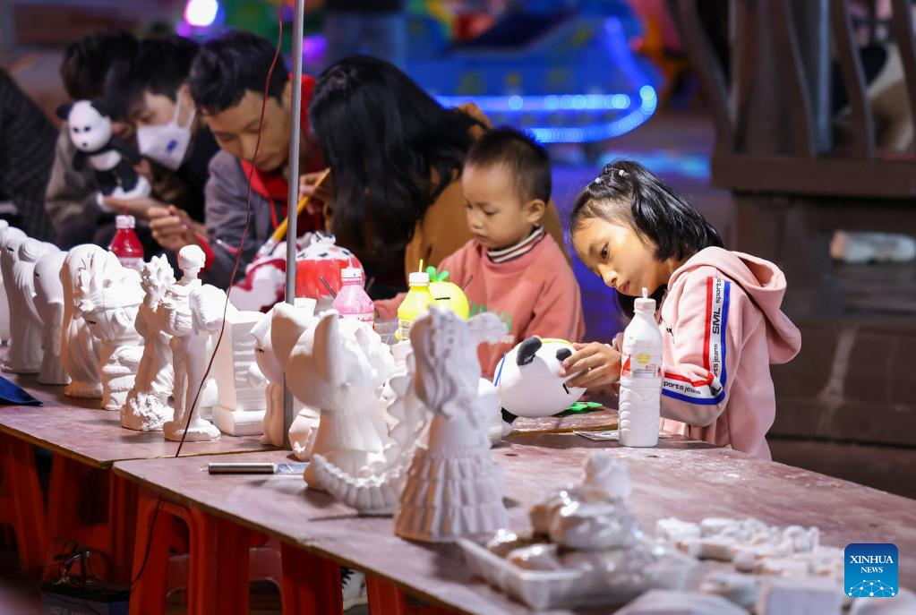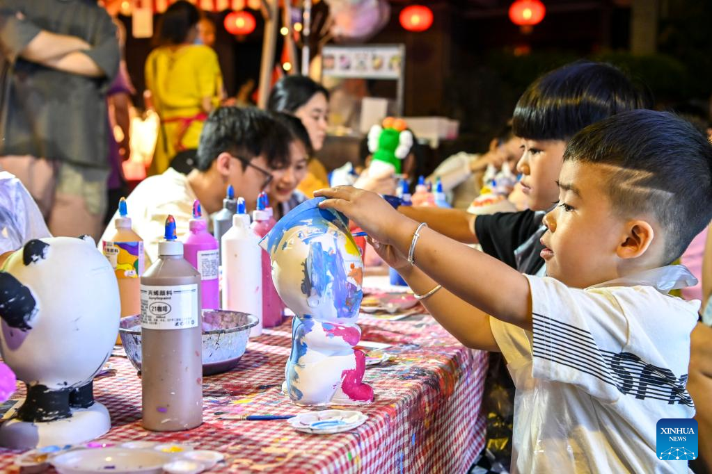 Kids color plaster statues at a night fair in Nanning, south China's Guangxi Zhuang Autonomous Region, Oct. 1, 2022. Various nightlife activities enrich people's leisure time during the National Day holiday. (Xinhua/Cao Yiming)