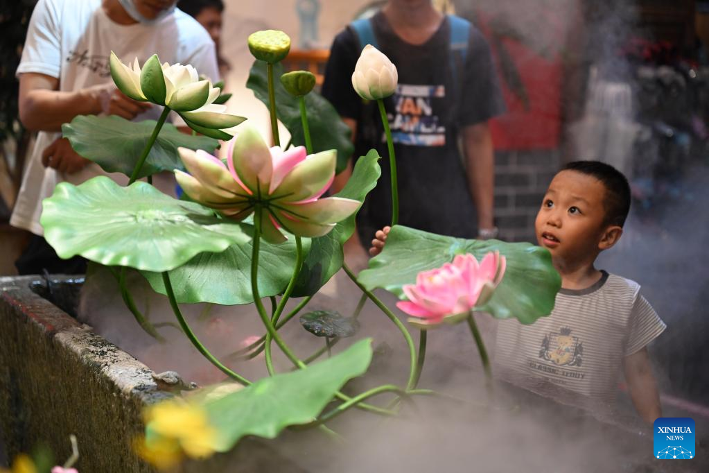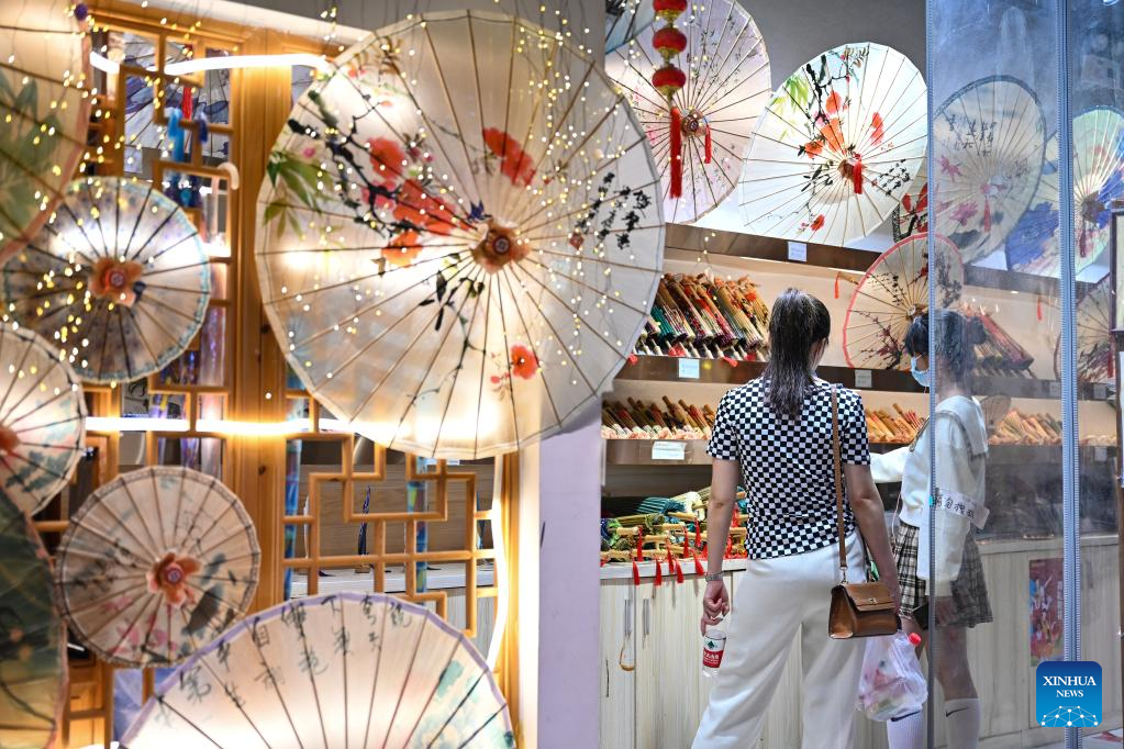 Tourists have fun at a commercial town in Mengzi, southwest China's Yunnan Province, Oct. 5, 2022. Various nightlife activities enrich people's leisure time during the National Day holiday. (Photo by Wang Yu/Xinhua)