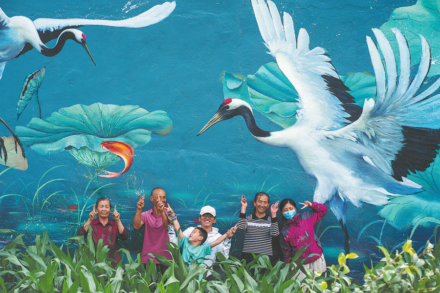 The artist (middle) celebrates the completion of the work with villagers. [Photo/Xinhua]