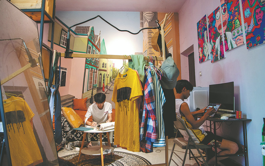 Liu (left) does a preliminary sketch on paper at home. [Photo/Xinhua]