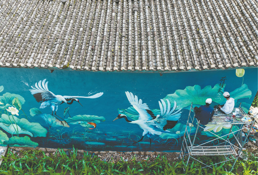 Sitting on a scaffolding platform, Liu Zhicheng gives the final touches to a painting of lotus flowers and cranes. With brushes and paints he makes the two cranes look vivid — flapping their wings and ready to catch a fish — on the wall of a building in Yongsheng county, Lijiang city, Southwest China's Yunnan province.