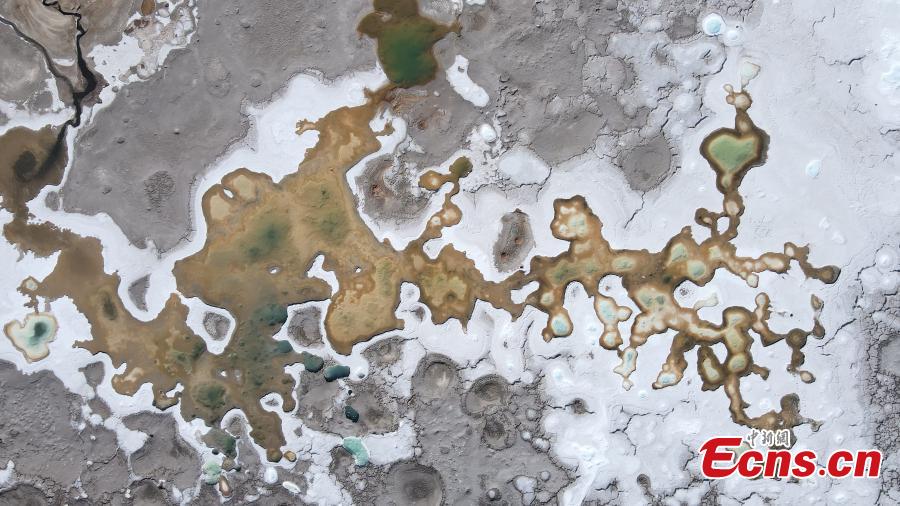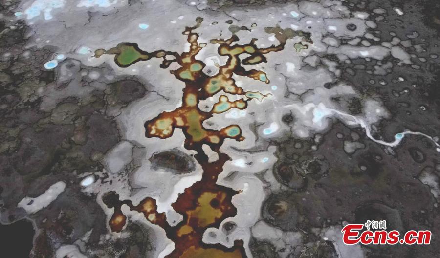Drone photo shows the natural landscape of the Gaskule Lake in Mangya city, northwest China's Qinghai Province. The brine overflows to the salt flat, looking like an ink painting. (Photo: China News Service/Tang Tuohua)