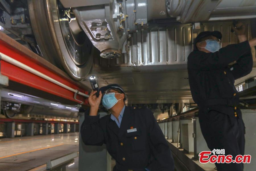A technician inspects a Fuxing bullet train at a maintenance station of Nanchang Railway in Nanchang, east China's Jiangxi Province, Oct. 8, 2022. (Photo: China News Service/Liu Lixin)