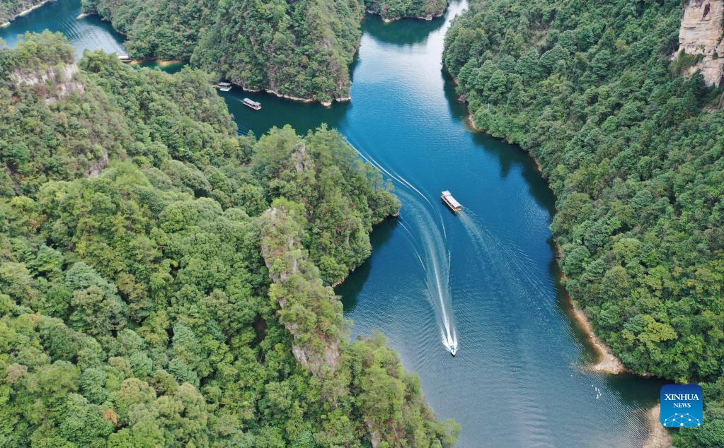 Tourists take boat tour during the week-long National Day holiday at Baofenghu scenic area in Zhangjiajie, central China's Hunan Province, Oct. 2, 2022. (Photo by Wu Yongbing/Xinhua)