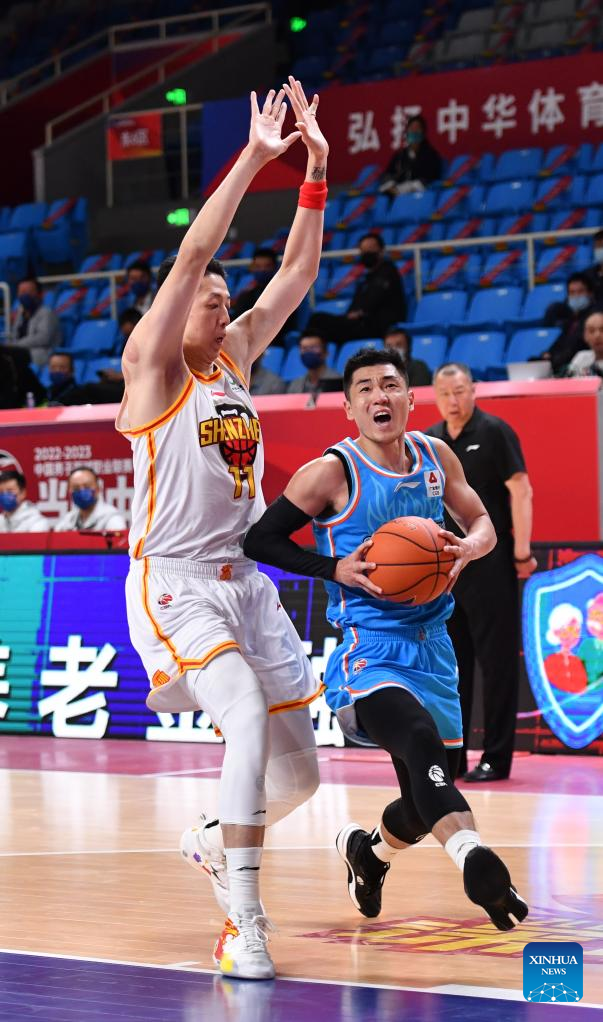 Gao Shiyan (R) of Shandong Heroes breaks through during the 1st round match between Shenzhen Leopards and Shandong Heroes at the 2022-2023 season of the Chinese Basketball Association (CBA) league in Hangzhou, east China's Zhejiang Province, Oct. 10, 2022. (Xinhua/Chen Zhenhai)