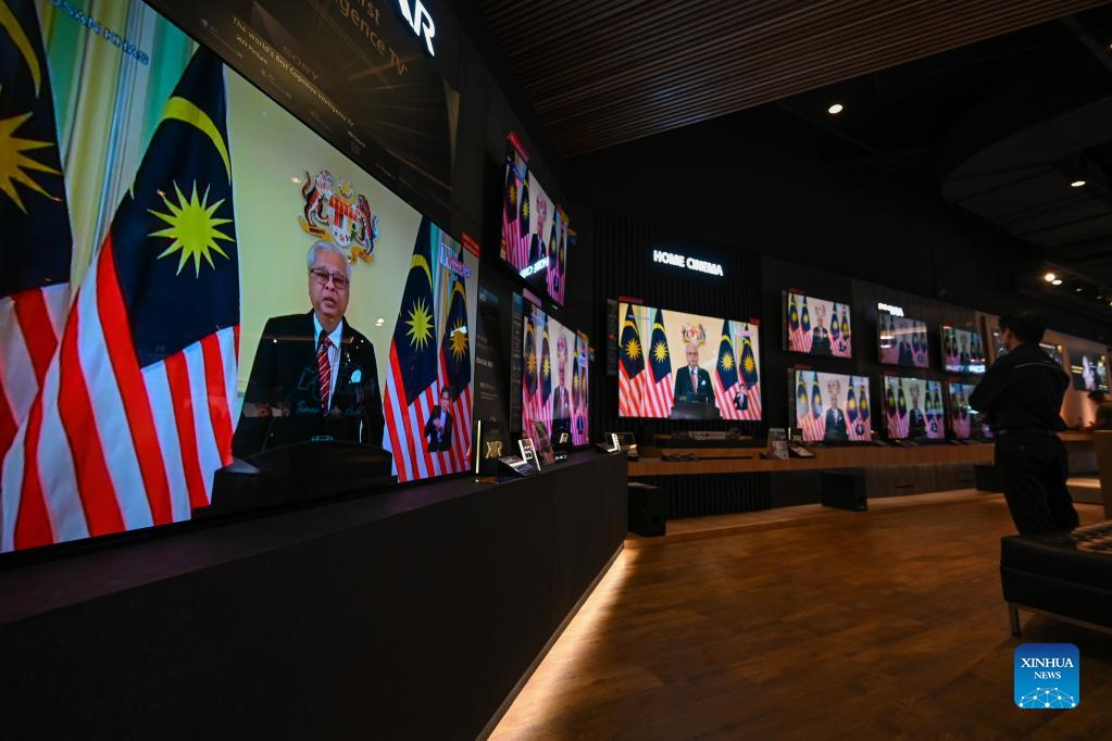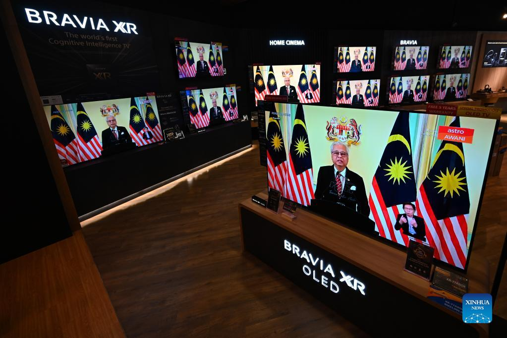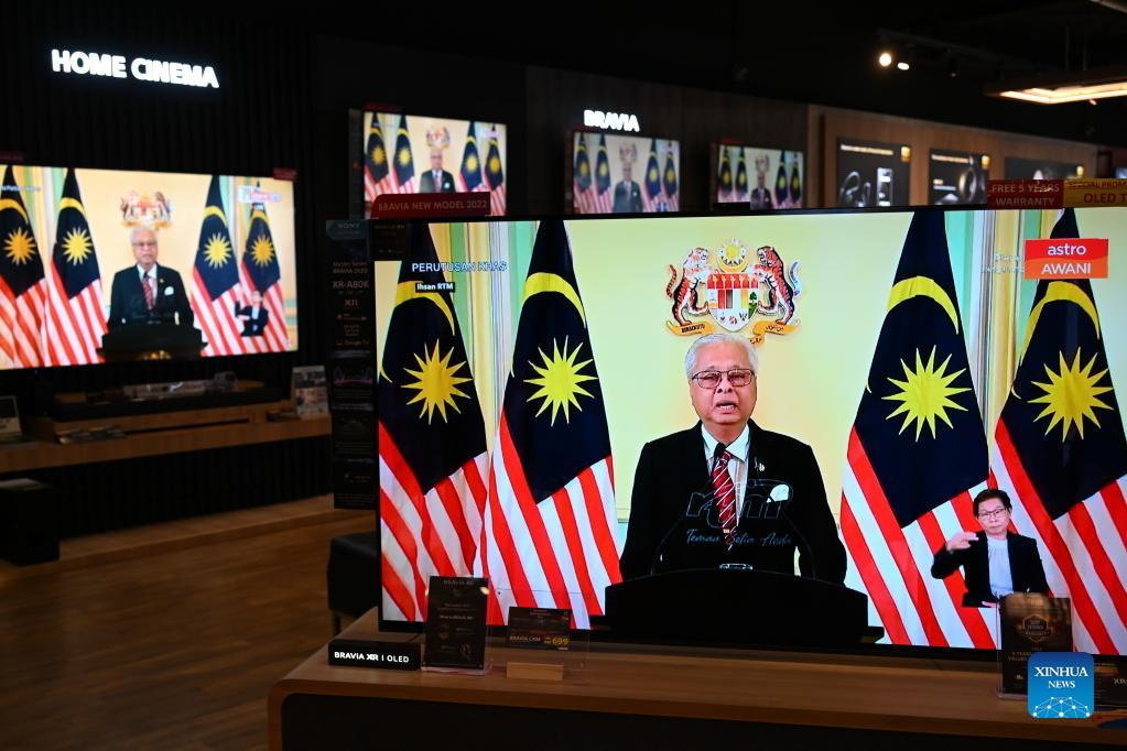 TV screens displayed at a local home appliance store show a televised speech by Malaysian Prime Minister Ismail Sabri Yaakob in Kuala Lumpur, Malaysia, Oct. 10, 2022. Malaysian Prime Minister Ismail Sabri Yaakob announced the dissolution of the country's parliament on Monday, paving the way for national elections which must be held in the next 60 days. In a televised speech, Ismail Sabri said he had received the consent of the country's King Sultan Abdullah Sultan Ahmad Shah in accordance with the country's constitution. (Xinhua/Zhu Wei)