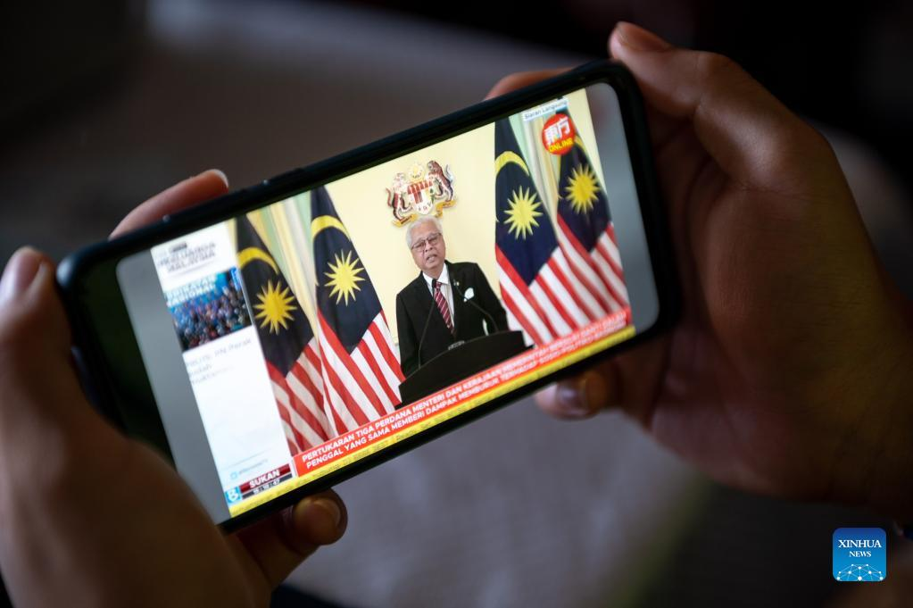 A man watches on his mobile phone a televised speech by Malaysian Prime Minister Ismail Sabri Yaakob in Kuala Lumpur, Malaysia, Oct. 10, 2022. Malaysian Prime Minister Ismail Sabri Yaakob announced the dissolution of the country's parliament on Monday, paving the way for national elections which must be held in the next 60 days. In a televised speech, Ismail Sabri said he had received the consent of the country's King Sultan Abdullah Sultan Ahmad Shah in accordance with the country's constitution. (Photo by Chong Voon Chung/Xinhua)