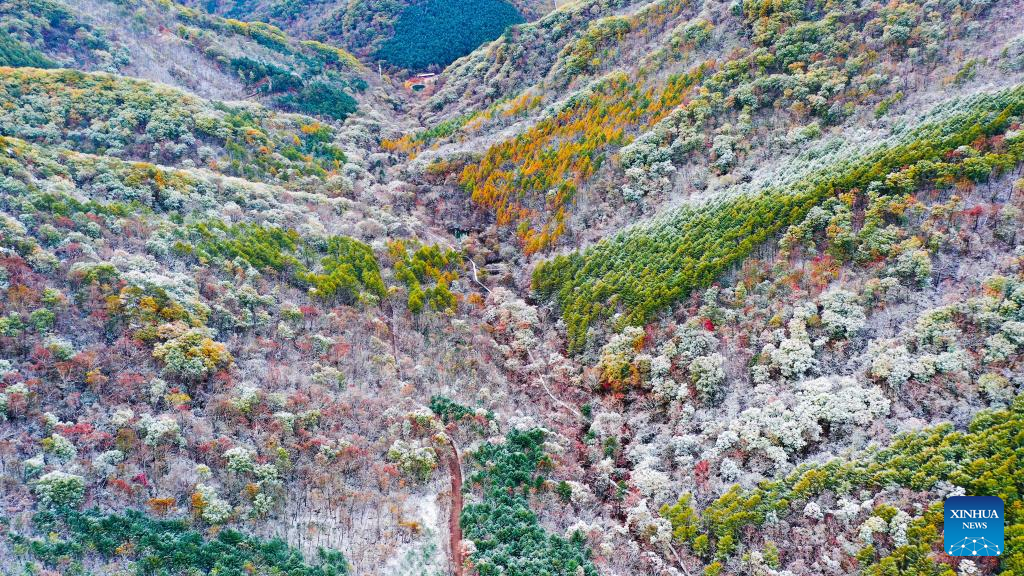 Aerial photo taken on Oct. 10, 2022 shows a view of Tianqiaogou forest park after snow in Dandong, northeast China's Liaoning Province. (Photo by Zhang Xiaoqiang/Xinhua)