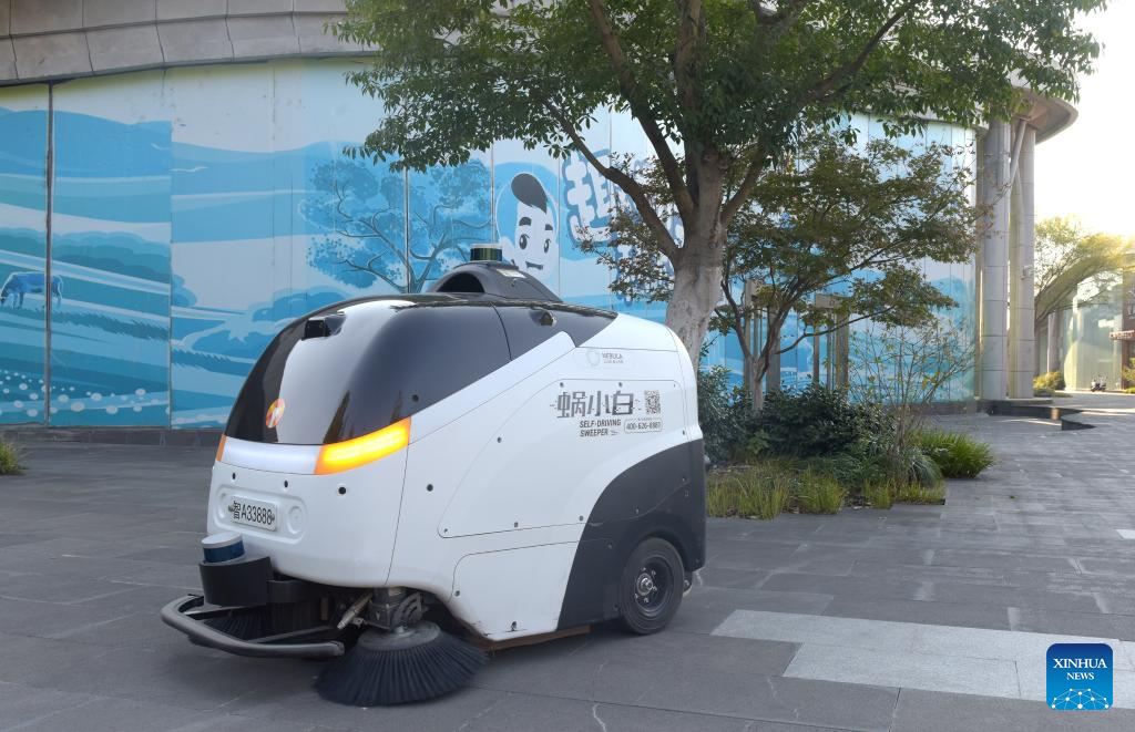 An unmanned sweeper works in Binhu National Forest Park in Hefei, east China's Anhui Province, Oct. 11, 2022. A project promoting self-driving vehicles has been implemented in the Binhu National Forest Park of Hefei recently. Self-driving tour bus, unmanned vending vehicle, unmanned sweeper and other vehicles have been put into use to serve tourists. (Xinhua/Guo Chen)