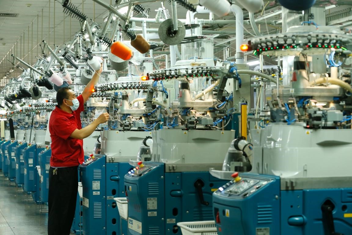 A worker is producing commodities to be exported in a workshop of a hosiery company in Qingdao, east China's Shandong province, June 8, 2022. (People's Daily Online/Liang Xiaopeng)