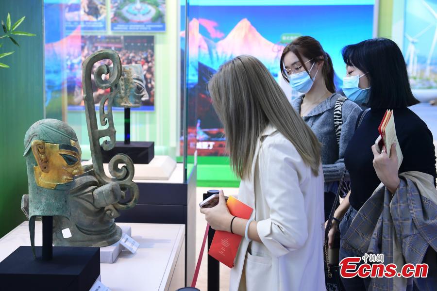 Visitors view cultural relics unearthed from Sanxingdui Ruin site during the themed exhibition "Forging Ahead in the New Era" at the Beijing Exhibition Hall in Beijing, Oct. 11, 2022. (Photo: China News Service/Tian Yuhao)