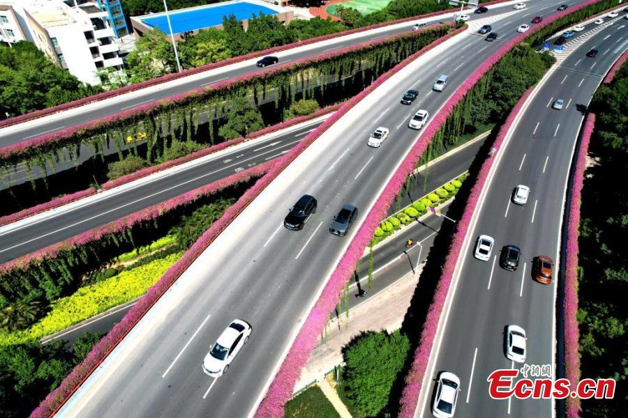 Cars run past blooming Bougainvillea on a viaduct in Fuzhou, east China's Fujian Province, Oct. 11, 2022. (Photo: China News Service/Wang Dongming)