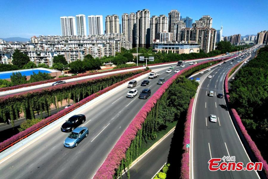 Cars run past blooming Bougainvillea on a viaduct in Fuzhou, east China's Fujian Province, Oct. 11, 2022. (Photo: China News Service/Wang Dongming)