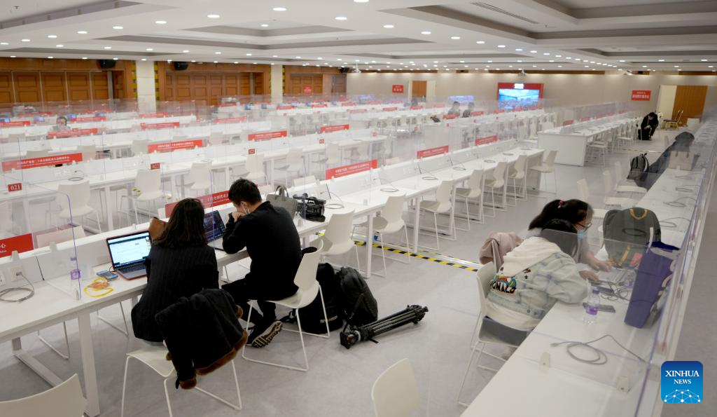 Journalists work at the reporter workspace of the press center for the 20th National Congress of the Communist Party of China (CPC) in Beijing, capital of China, on Oct. 12, 2022. The press center for the upcoming 20th National Congress of the Communist Party of China (CPC) officially opened on Wednesday to provide services for journalists covering the congress. (Xinhua/Wang Yuguo)